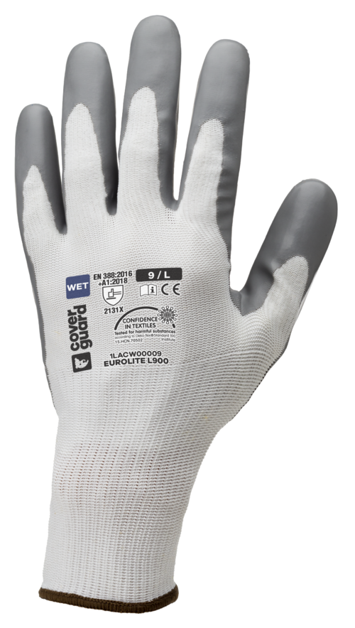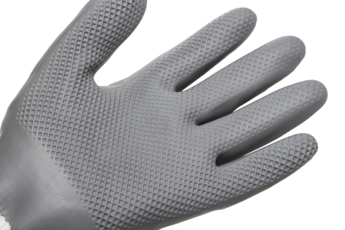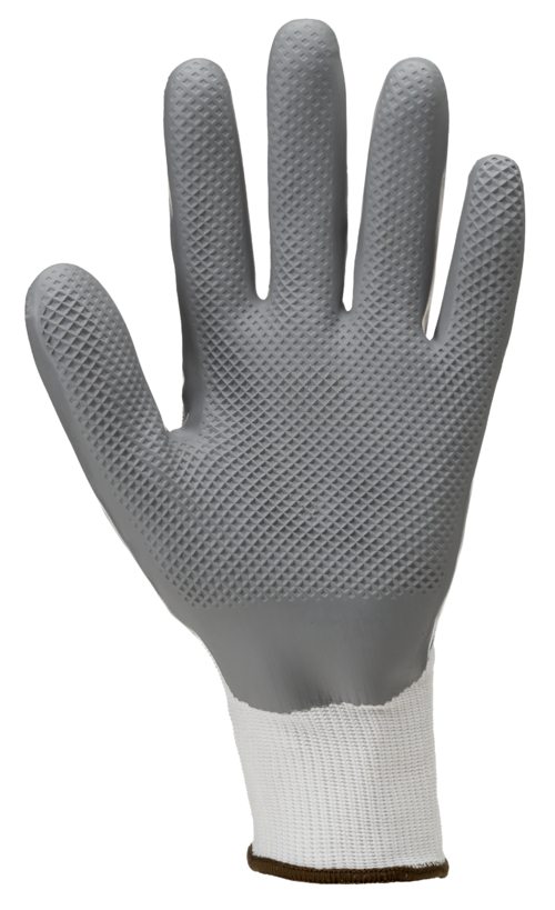 Tricot blanc à base de polyester recyclé (85%) et élasthanne (15%), Enduction latex gris embossé : adhérisation losange, Poignet tricot, Certified OEKO-TEX® STANDARD 100, CQ 1301/2, IFTH